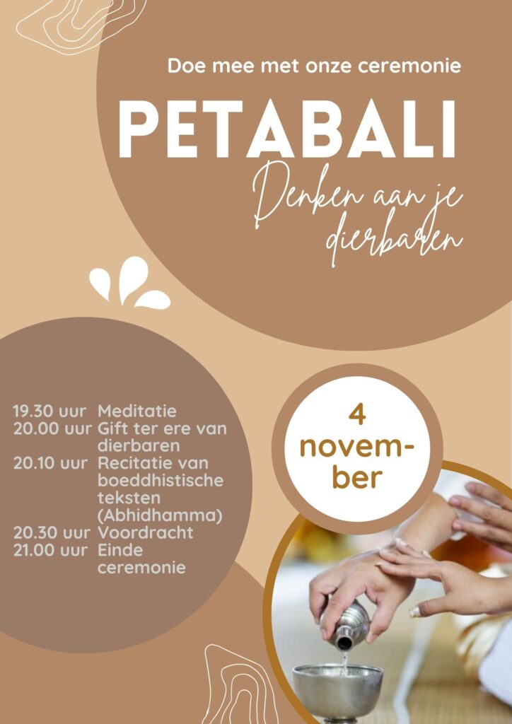 Op 4 november om 19.30 uur houden we een ceremonie om overleden dierbaren te herdenken. In Thailand is het al lange tijd gebruikelijk goede karma te delen met overledenen op de volle en nieuwe maan tijdens de Petabali, “de offerande aan de overledenen”. Om aan te sluiten bij de Nederlandse traditie van Allerzielen, houden we geregeld de Petabali in het Nederlands begin november. Dit is een mooie gelegenheid om mensen die veel voor je hebben betekend te herdenken op een serene manier.